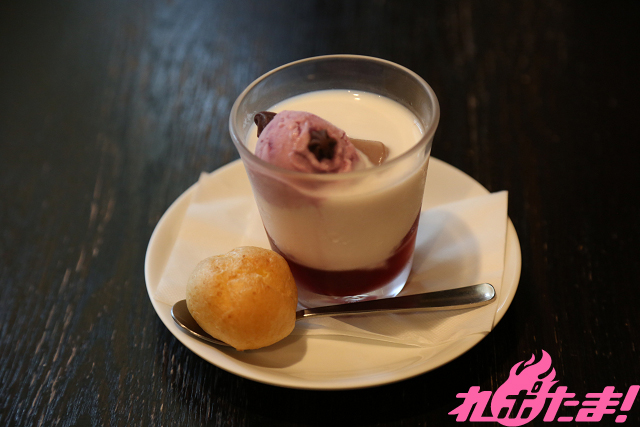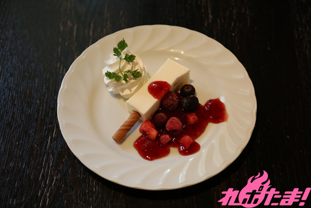レナが持つ鉈をイメージしたレアチーズケーキにミックスベリー入りのストロベリーソースをどろっとかけました。