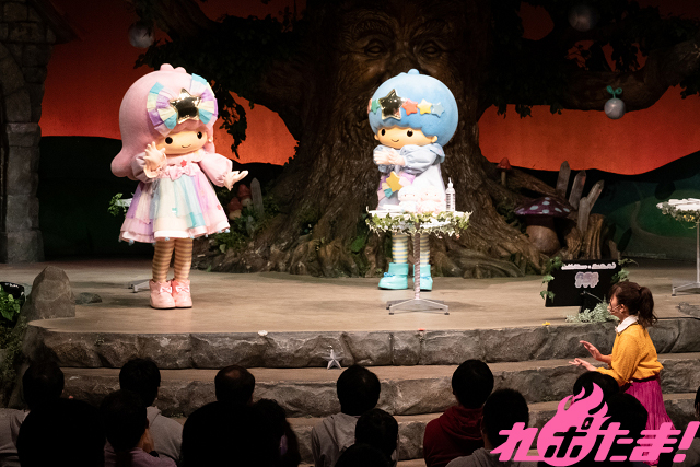キキくんからの手紙には「さちかちゃんと仲良くなりたいからナカヨシ☆ボトルを用意したよ」と書かれており、ステージ上に隠されたボトル探しをすることに。客席の力も借りて無事4つのボトルを見つけると、続けて中に入っていた様々なお題にチャレンジ! ララちゃんの趣味というお絵かきに挑戦したり、リトルツインスターズ45周年記念フードの試食をするなどして楽しんだ。またキキくんからの「さちかちゃんの趣味は何?」という質問にはサスペンスドラマを見る事と答え、さらには「科捜研の女に死体役として出演したい」と夢を語り会場の笑いを誘っていた。