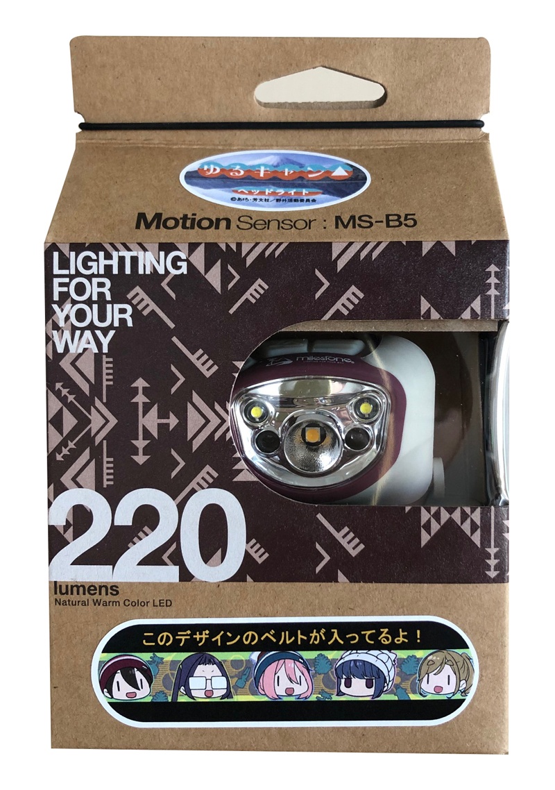 キャンプのマストアイテムであるヘッドライト、そのヘッドライトの「ゆるキャン△」版が遂に発売となります!「ゆるキャン△ヘッドライト」は、本格的な220ルーメンのLEDヘッドライト。モーションセンサー機能搭載なので、手をかざすだけでON/OFF可能となり、手が汚れている時にもさっと点けられる優れものです!また、無段階照度調整が可能で照度を低くした場合、約45時間使用する事ができますので、電池を気にせず使用する事ができます。