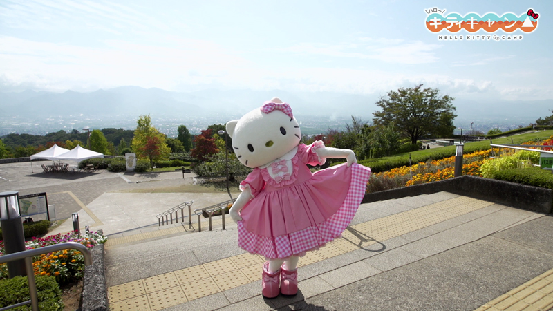 TVアニメ『ゆるキャン△』第4話に登場したモデル地「笛吹川フルーツ公園」を訪れたキティちゃん。野外活動サークル(以下、野クル)と同じように、甲府盆地の見晴らしやスイーツを堪能するキティちゃんの愛らしい姿が見どころです。