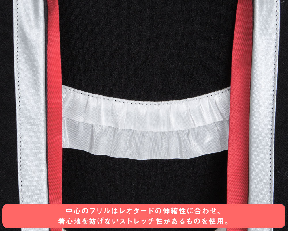 ■中心についたフリルはレオタードの生地に合わせて伸縮性のある素材を使用。