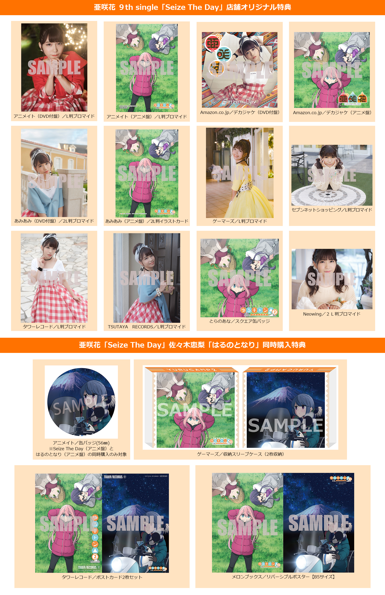 ▲Neowing 【対象商品】DVD 付盤、アニメ盤 2L 判ブロマイド(亜咲花撮り下ろし写真/複製サイン&コメント入り) 亜咲花「Seize The Day」、 佐々木恵梨「はるのとなり」(TVアニメ「ゆるキャン△ SEASON2」ED)同時購入特典
