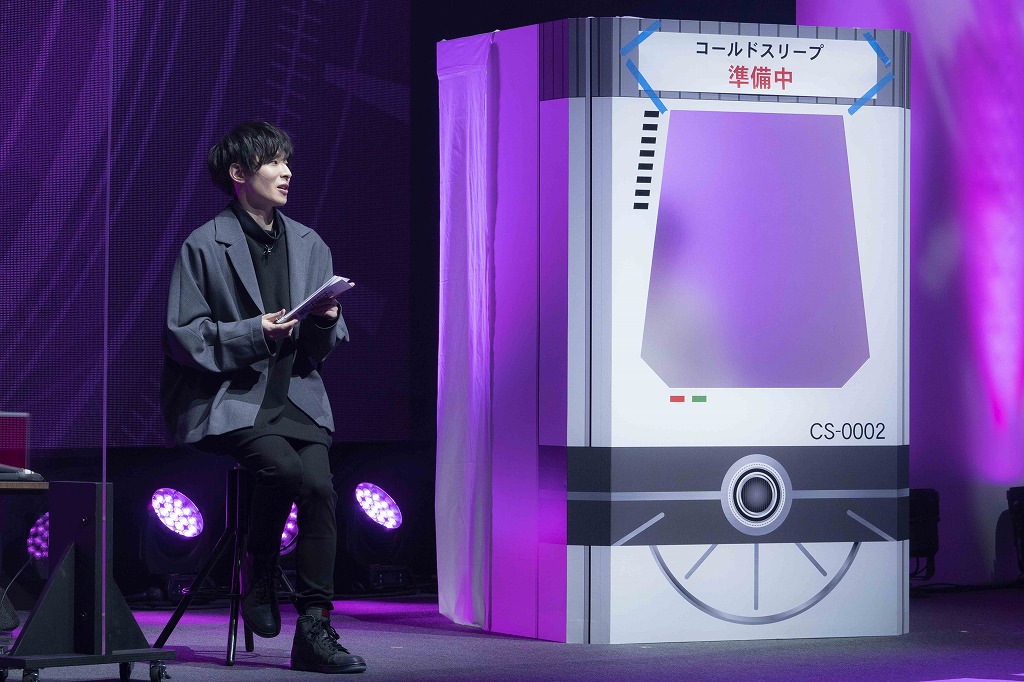 出演者は、市川太一さん(水原怜人 役)、白石晴香さん(周防美来 役)、大地葉さん(龍造寺朱音 役)、山根綺さん(山田翠 役)。さらに、強力な助っ人として原作のLINK先生が、コールドスリープ装置を模したセットごしに出演しました。