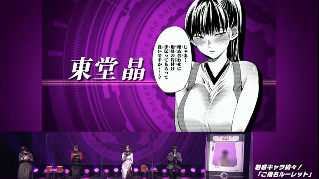 次のコーナー「待ちきれない!『終末』へのカウントダウン」では、LINK先生がアニメ化を楽しみにしているシーンが紹介されます。選りすぐりのシーンがモニターに映し出されるのですが……「WARNING」のマークで隠され、まったく見えません! 実は、こちらは怜人が美来たちと温泉に入るシーンでした。なんとも心躍る場面ですが、詳細は原作を読んでいただくか、TVアニメ化をお待ちください! ちなみにLINKさんがこのシーンを選んだ理由は、「温泉が好きだから」とのこと。「エッチなのは苦手」と話していましたが、声優陣に思い切りツッコミを入れられ笑いを誘いました。