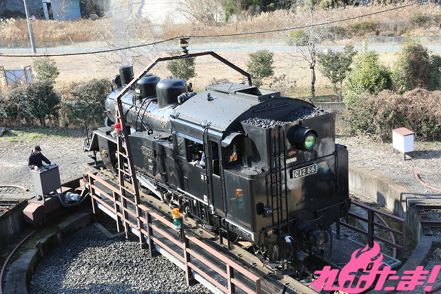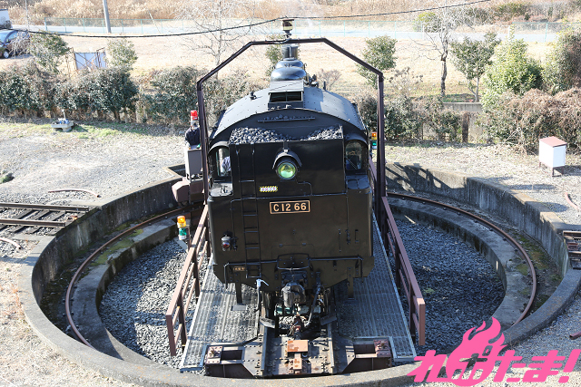 茂木駅に着くと復路の列車が発車するまで約2時間の自由時間が。 この間は写真撮影タイムだ。 一番の見所は機関車がターンテーブルに乗って向きを変えるシーン。線路わき、ターンテーブルのすぐ目の前に撮影スポットが設けられた。皆がカメラを構える場所に向かってゆっくりと、けれど力強く、シュッシュッと音を立てながら近づいてくる姿は迫力満点で、歓声が上がった。