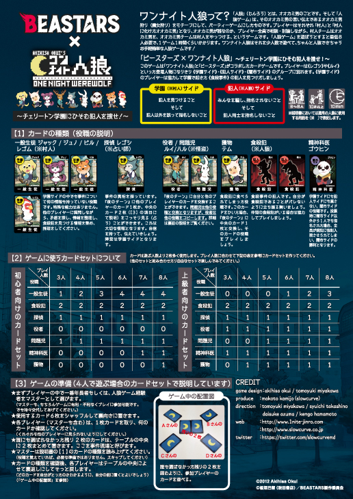 カードゲーム「ビースターズ×ワンナイト人狼」~チェリートン学園にひそむ犯人を捜せ!~は、作品の世界観そのままに、チェリートン学園で起こった『食殺事件』の犯人を捜し出すゲームとなります。プレイヤーは、「学園サイド」に属するレゴシやルイといったキャラクターになりきり、「食殺犯サイド」に属する事件の犯人を捜し出します。
