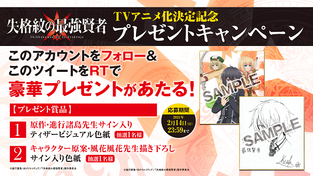 『失格紋の最強賢者』TV アニメ化決定を記念して、「原作・進行諸島先生サイン入りティザービジュアル 色紙」や「キャラクター原案・風花風花先生描き下ろしサイン入り色紙」が当たる Twitter フォロー&RT キャンペーンを開催します! 両先生直筆による貴重なアイテムが手に入るチャンスをぜひお見逃しなく!