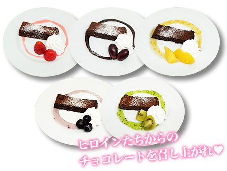 濃厚なガトーショコラにそれぞれのヒロインをイメージしたデコレーション♪