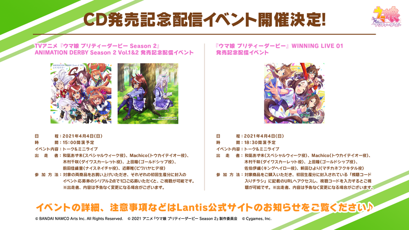 ■「TV アニメ『ウマ娘 プリティーダービー Season 2』ANIMATION DERBY Season 2 vol.1&2」と 「『ウマ娘 プリティーダービー』WINNING LIVE 01」の CD 発売記念配信イベントの開催が決定!!