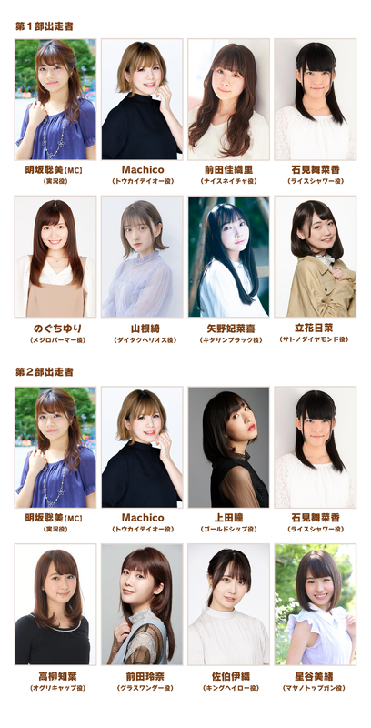 出走者: 第 1 部 明坂聡美【MC】(実況役)、Machico(トウカイテイオー役)、前田佳緒里(ナイスネイチャ役)、石見舞菜香(ライスシャワー役)、のぐ ちゆり(メジロパーマー役)、山根綺(ダイタクヘリオス役)、矢野妃菜喜(キタサンブラック役)、立花日菜(サトノダイヤモンド役)