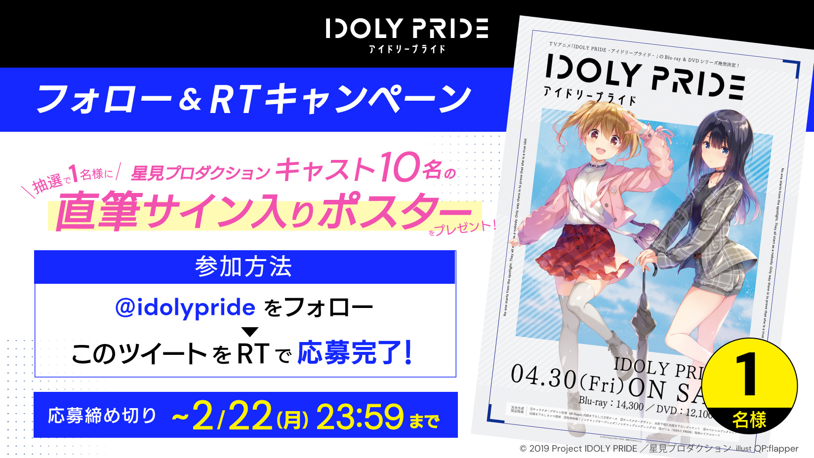 応募方法:公式アカウント(@idolypride)をフォロー&該当ツイート RT にて抽選で 1 名様に、「星見プロダクションキャス ト 10 名の直筆サイン入りポスター(非売品)」をプレゼント 応募期間:2021 年 2 月 15 日(月)00:00~2021 年 2 月 22 日(月)23:59