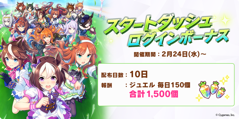 ゲームを開始してからログイン合計日数が 10 日になるまで、ログインごとにジュエル 150 個を獲得。10 日間ログイン すると、合計でジュエル 1,500 個を獲得できます。