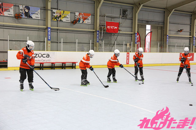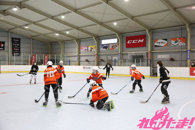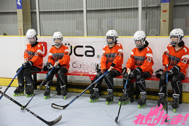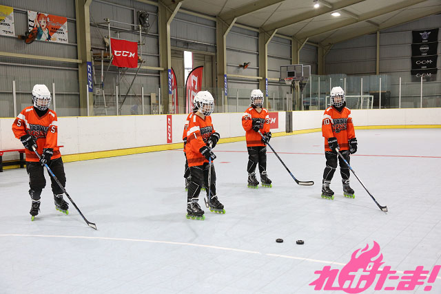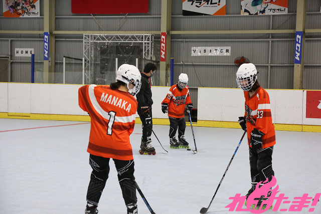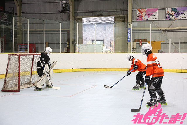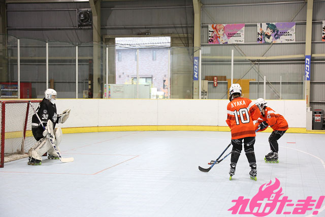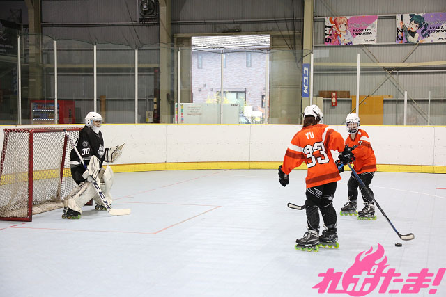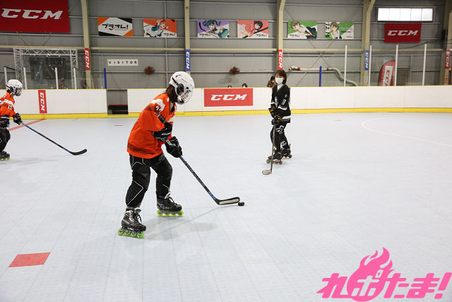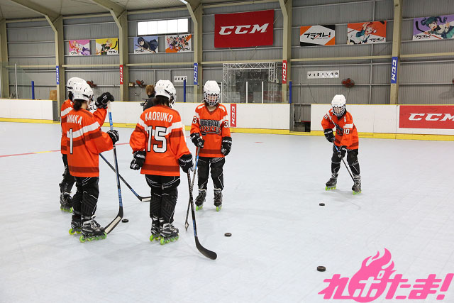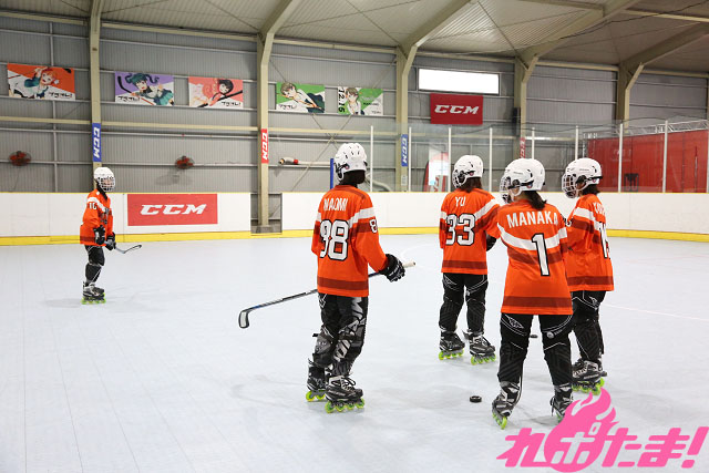 この日は水沢愛佳役・増田里紅、清瀬 優役・本郷里実、水沢彩佳役・相良茉優、柳田薫子役・森山由梨佳、小野真美役・青山吉能が“人生初”のインラインホッケーに臨んだ。