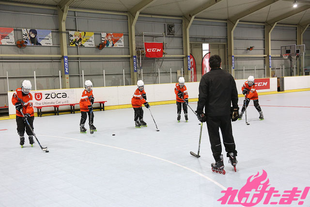 アイスホッケーの元・日本代表、さらに日本代表の監督を経て、現在は東洋大学の監督を務める鈴木貴人氏をコーチに迎え、最初はスティックの持ち方をレクチャー。