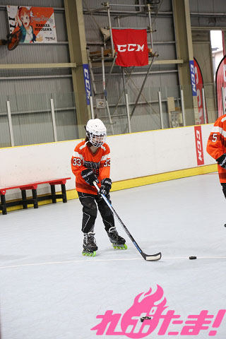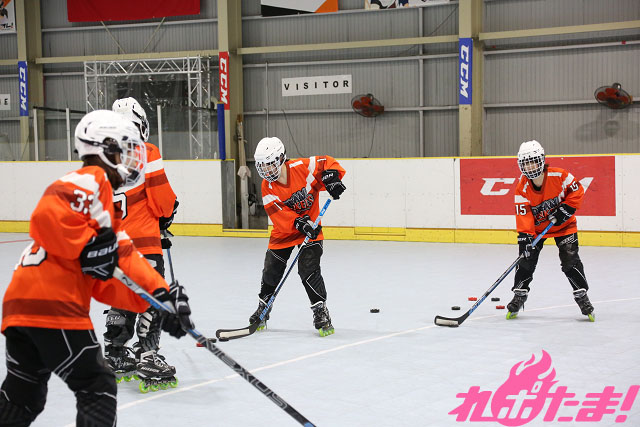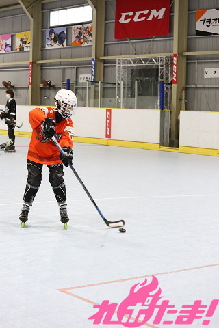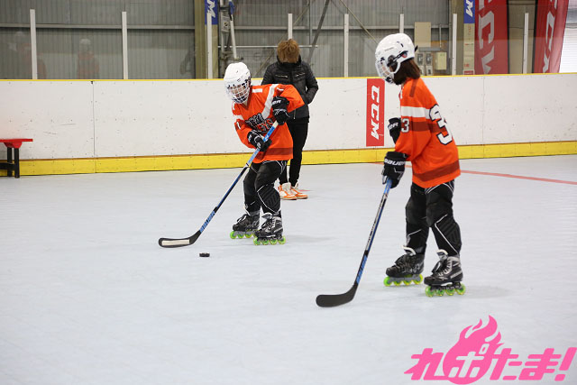 続いてはドリブルの練習。スティックをたくみに操りながら、パックを運んでいく。