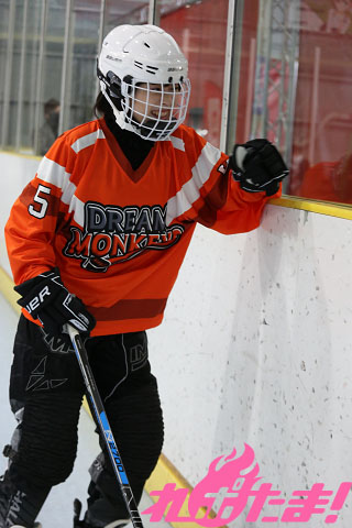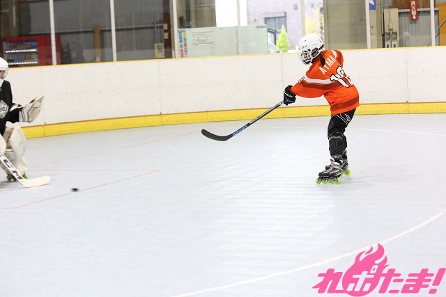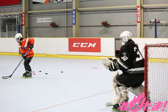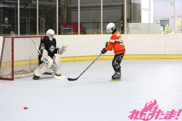 シュート練習では、最初は打ち込んだパックが気持ち良くゴールに吸い込まれていくものの、途中からゴールキーパーが立つと、そうはいかない様子……。
