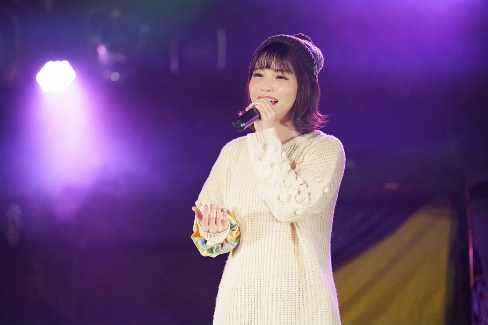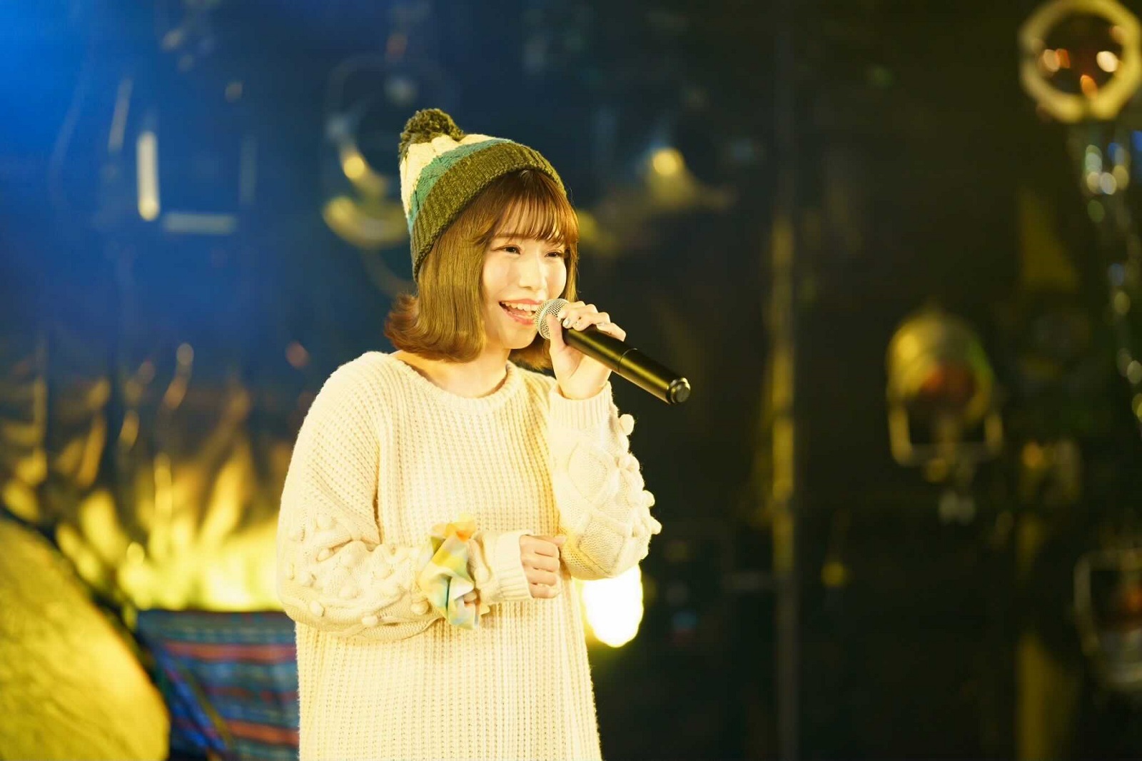 『ゆるキャン△』楽曲をはじめとした“ゆるっと”聴きたい亜咲花の楽曲で構成されたオンラインライブ&トークは、テントやキャンプチェアが並ぶステージに「SHINY DAYS」や「Seize The Day」のMVでおなじみの白いニットワンピの衣装で登場。スポットライトに照らされ「1,2,3」のカウントで「Isn’t It Fun?」からスタート。のびのびとした歌声が心地よく響き渡る。
