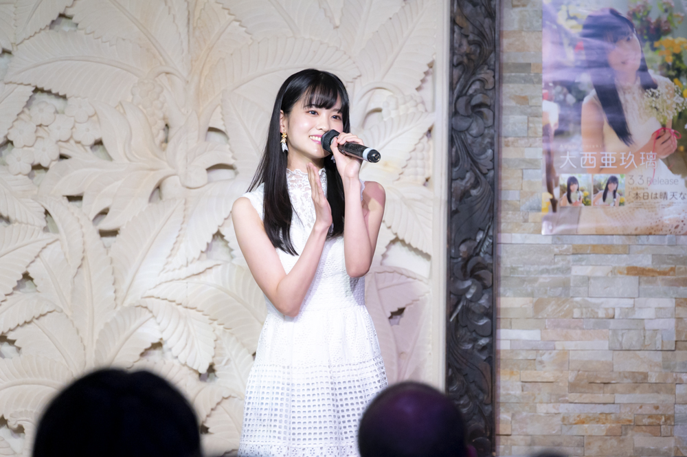 大きな拍手に迎えられて、会場の入口から登場した大西さん。オープニングは、ひな祭りの思い出や自身のプロフィールについて。そして、「本日は晴天なり」の制作裏話などを話していく。さらにそこからスペシャル企画「教えて、あぐリリック!」という、デビュー曲「本日は晴天なり」からお気に入りの歌詞を3つチョイスし、それについての思いを語るコーナーをしたり、この日にフルサイズで公開されることとなったMVをみんなで鑑賞するなどして楽しんだ。