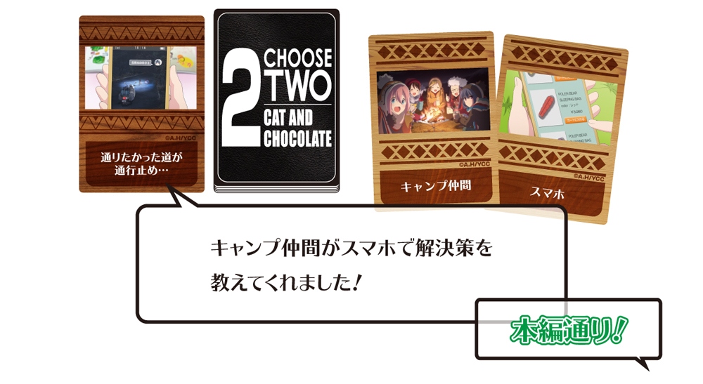 さらに、アニメ「ゆるキャン△」本編と同様の方法でアクシデントを回避できた場合は、「本編通り!」や「アニメで見たやつ!」などと褒め合うエクストラルールを採用しています。以下のような感じとなります。
