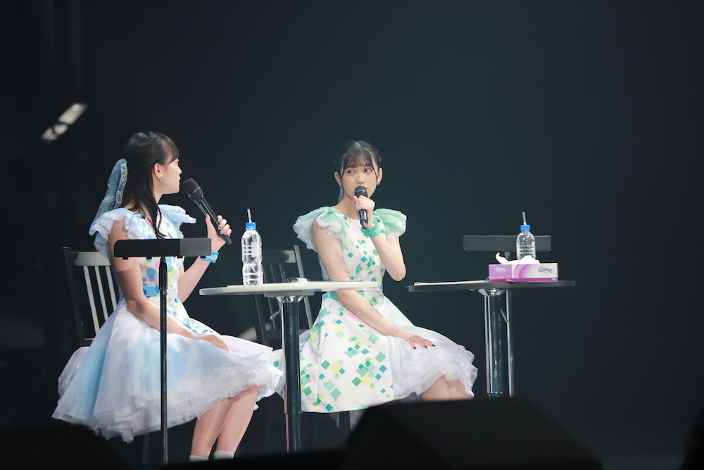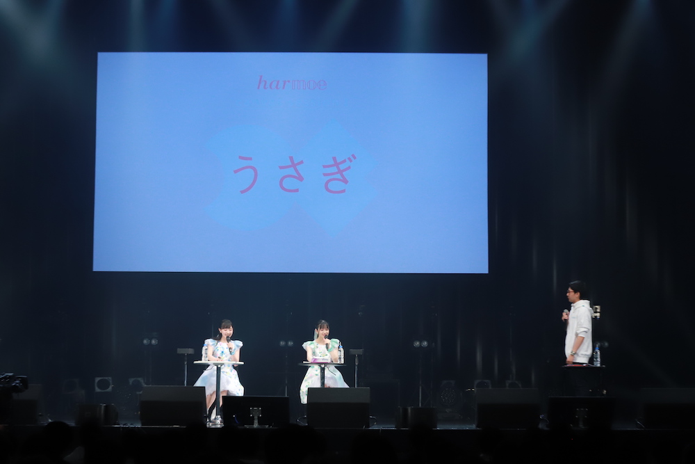 この日の司会進行として細田健太も登壇すると、まずは会場に来ているファンからのメッセージを紹介するコーナーに。初のイベントとなるharmoeに、「2人がルームシェアするとしたらどんな役割分担にしますか?」「お互いに凄いなと思うところは?」「学生時代にやり残したことは?」といった質問に、笑いをまじえながら回答していく。ここでharmoeファンの呼称を決めることになり、オフィシャルFC名の『はるもえroom』にあやかって、”ルームメイト”と呼ぶことが決まった。