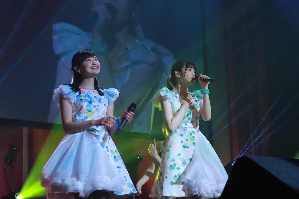 3月に発売されたデビューシングル「きまぐれチクタック」が、オリコンウィークリーランキング10位を獲得するなど、期待の眼差しが向けられているharmoeのイベントは、各部ともトークセッションからスタート。白を基調としたドレスに青色が散りばめられた岩田の衣装と、同じくグリーンが散りばめられた小泉のそれは、まるで童話の世界から飛び出してきたようだ。第1部では、最初の挨拶の時点で早くも2人の目から涙が溢れ、この日を無事迎えた喜びを噛み締めているようだった。