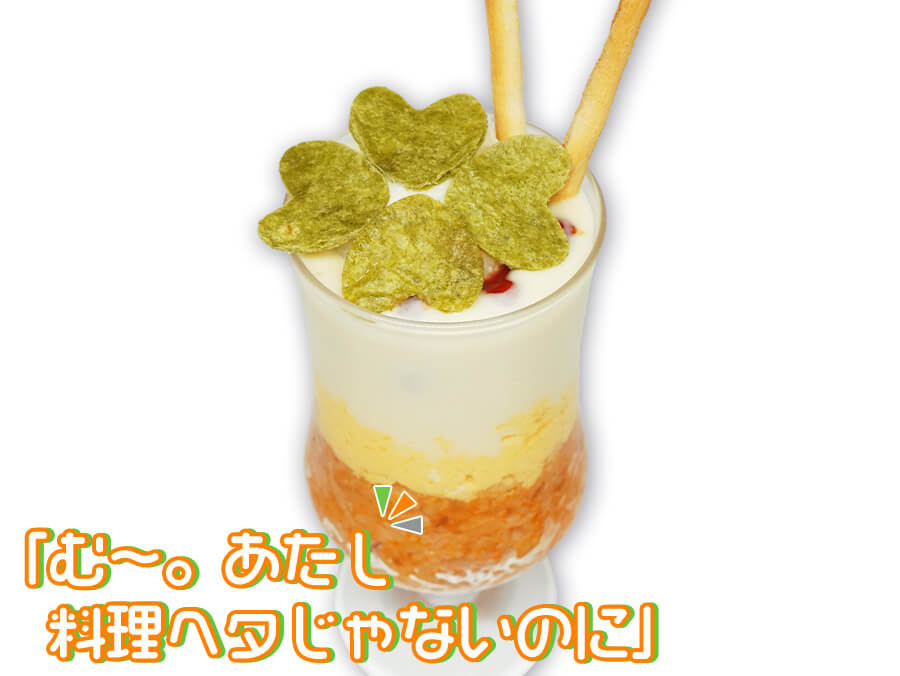 宇宙の舌を持つ黒羽をイメージして、見た目は甘いパフェなのに中身はオムライスな不思議メニュー!