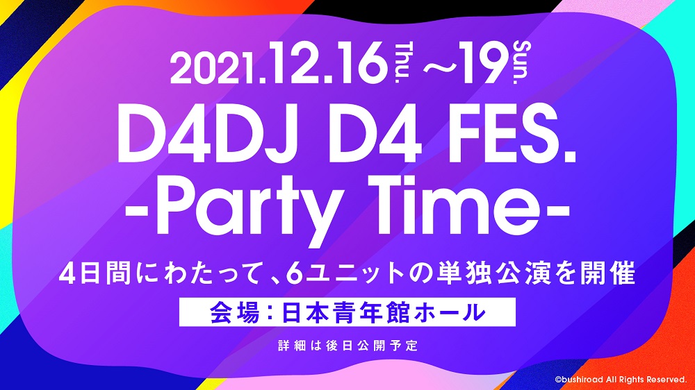 この日は7月22日(木)にHappy Around!のオンラインライブの開催、さらに各ユニットのソロ公演が4日かけて開催される「D4DJ D4 FES. -Party Time-」が2021年12月16日(木)~19日(日)に東京・日本青年館ホールで、そして2022年初夏に大型フェスの開催も発表された。