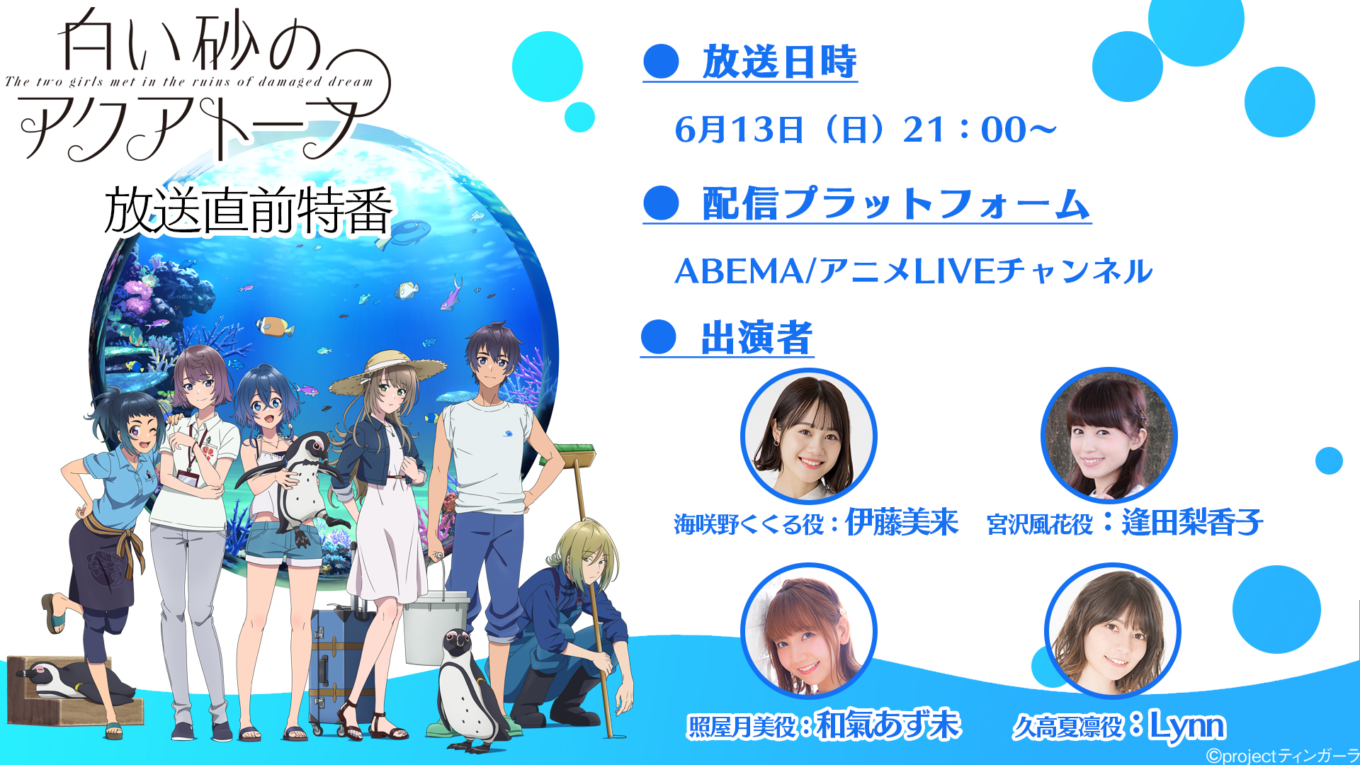 この度、6月13日(日)21時より、ABEMA/アニメLIVEチャンネルにて、“TVアニメ『白い砂のアクアトープ』放送直前特番”の配信が決定した。