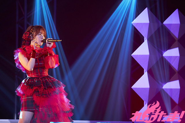 続いては富田さんが登場。真っ赤な衣装で登場し、あいさつ代わりに「Broken Sky」を披露。久しぶりにファンの前で歌えるよろこびをかみしめつつ、MCでは「私のお願いしたサイリウムを振ってください!」とお願いし、紫のサイリウムに照らされながら「Ageha Twilight」、そして1stアルバム『Prologue』に収録された「ジレンマ」を赤い光を受けながら歌唱した。最後は、同じく1stアルバムに収録され、自身が作詞をした「Letter」を披露。後方のモニターには歌詞が映し出され、感謝の気持ちを込めながら歌い上げた。