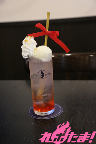 「イリヤ セイバー夢幻召喚(インストール)」(グアバシロップ+ソーダ+北海道ミルクアイス+ホイップ+赤リボン+金色ストロー+金箔)
