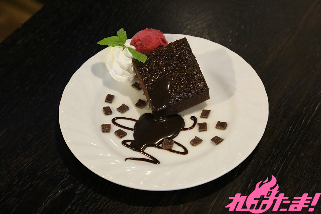 四角いブラウニーケーキに生チョコがたっぷりかけられ、ホイップとカシスソルベが添えられた、お腹が大満足のデザート。