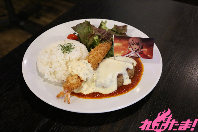 イリヤのセイバー夢幻召喚(インストール)をイメージしたプレート。大きなエビフライに中身の詰まったハンバーグ、野菜をバランスよく添えた、ボリューミーな一品。