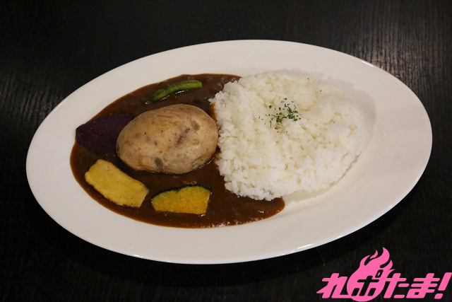丸ごと1個のじゃがいもに野菜チップスのじゃりじゃり感がクセになる、彩も鮮やかなカレー。