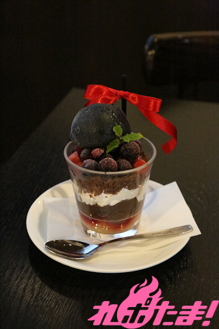 夏凪をイメージしたパフェ。特徴的な赤いリボンにチョコレートプリンと黒バニラ、ミックスベリーで黒いコーティングがされたスイーツ。
