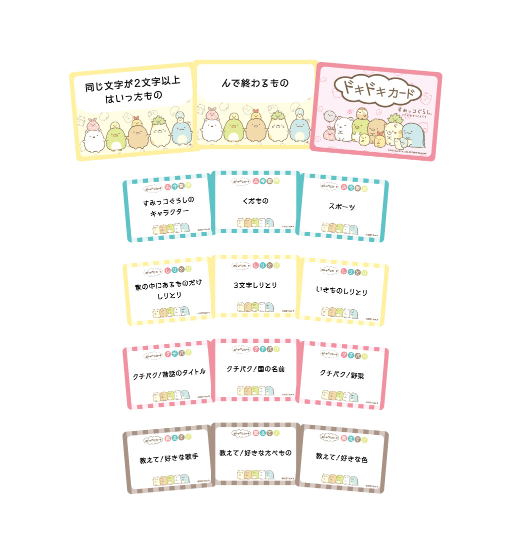 2021年11月より公開された映画第2弾も話題の、サンエックスの人気キャラクター「すみっコぐらし」。すみっこにいるとなぜか“落ちつく”。さむがりの“しろくま”、自信がない“ぺんぎん?”、食べ残し(?!)の“とんかつ”、はずかしがりやの“ねこ”、正体をかくしている“とかげ”など、ちょっぴりネガティブだけど個性的な“すみっコ”たちが、子供や女性層を中心に大人気となっています。そんな“すみっコ”や“みにっコ”たちと一緒にドキドキするトークゲームが登場しました!