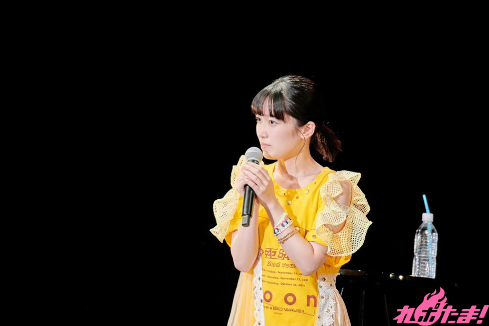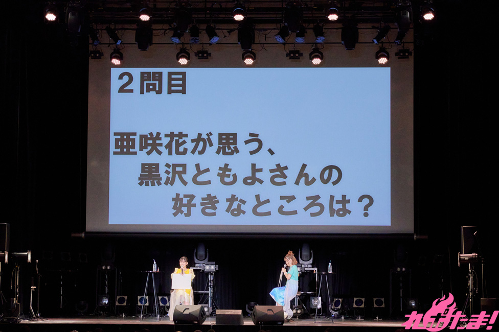 アンケートで選ばれた、青を基調とした名古屋公演のライブT衣装で登場した亜咲花さん。早速ゲストで大親友の声優・黒沢ともよさんを呼び込むと、なんと大阪公演で亜咲花さんが着ていた黄色のライブT衣装で登場。黒沢さんからの「本当に私でよかったの?」「そこまで仲がいいのかな……?」と不仲をにおわせる(?)発言に亜咲花さんはタジタジ(笑)