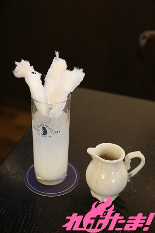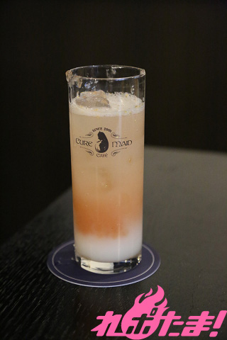 みこをイメージしたグレープソーダ。グラスの底で光るオレンジゼリーとゴールドのストローでみこの目の色をイメージ。ほどよい炭酸で、優しい飲み口となっている。