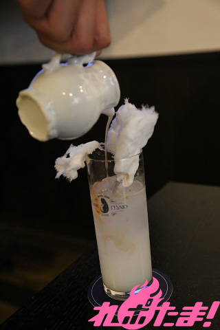 超さんかいをイメージした神々しいドリンク。わたがしにピンクグアバジュースをかけることで、白いわたがしがピンク色に染まり、“超さんかい”がガバっと口を開けた姿を再現! わたがしをドリンクに沈めると、みこの前から消えていった超さんかいのようにわたがしも消えていきます……。