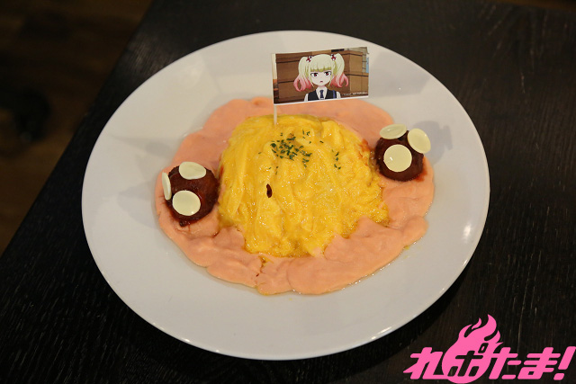 オムレツと明太子クリームソースでユリアの髪色を、チーズをトッピングしたミートボールで髪飾りのきのこを表現。オムライスと明太子クリームの相性は抜群!