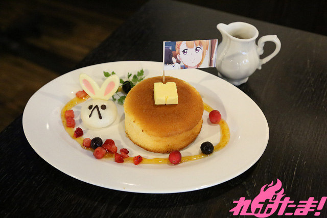 ハナが朝ごはんで食べていたパンケーキに、ラムラビのお饅頭を添えました。オレンジソースでハナのあふれる生命オーラをイメージ! パンケーキはボリューム満点で、モーニングにランチに、ディナーにもいけそう!?