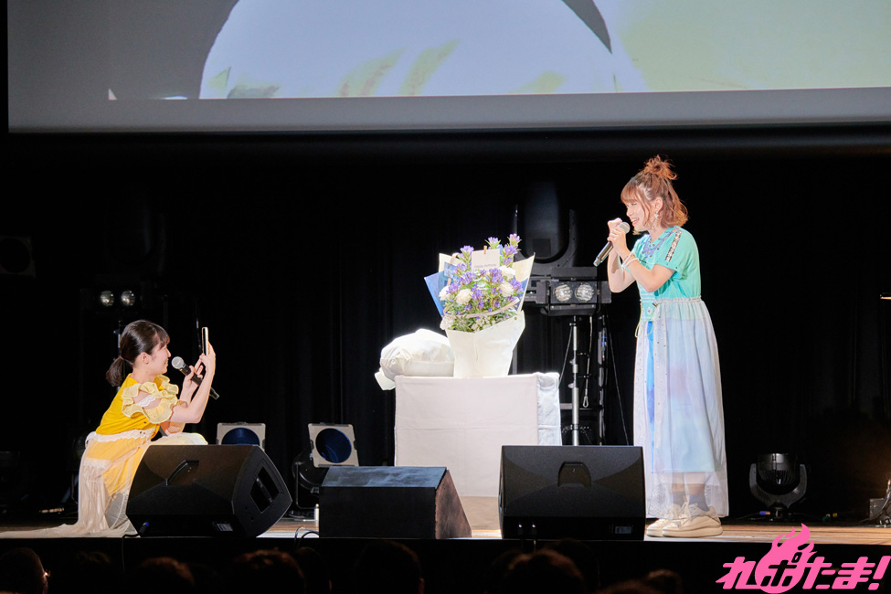 Asaka appeared at the live event in Nagoya wearing a blue T-costume which was decided by vote. Her friend Tomoyo Kurosawa was invited, and appeared in a matching costume in the color yellow, which is what Asaka wore during the Osaka event. After Kurosawa said with some doubt “Are you really okay with being like me…?” and “Are we really that close…?” Asaka couldn’t help but cringe a bit at the situtation (lol)