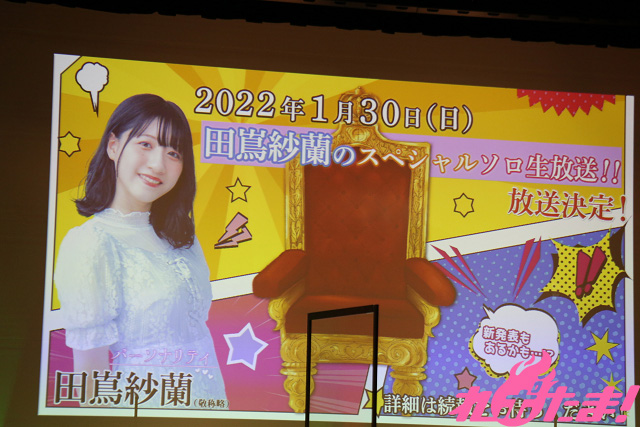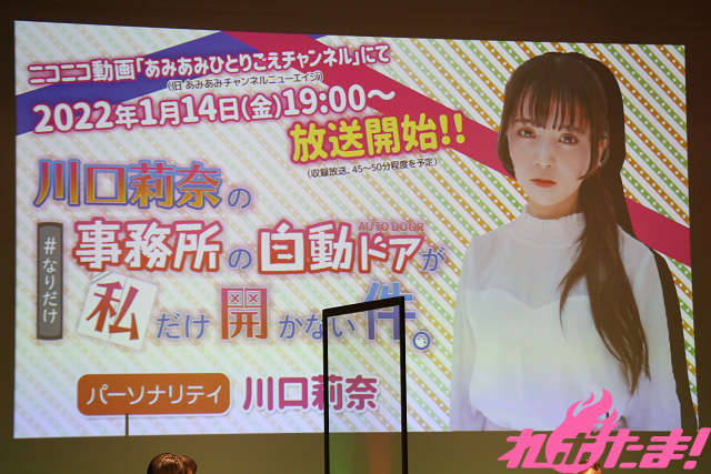 1時間に渡って行なわれてきた配信も、早くもたけなわ。最後にゲスト2人に関するうれしいお知らせが! 1月30日(日)に田嶌さんによる「スペシャルソロ生放送」、そして1月14日(金)から川口さんの新番組『川口莉奈の事務所の自動ドアが私だけ開かない件。』のレギュラー放送が開始されることが発表され、場内からは大きな拍手が上がったのだった。