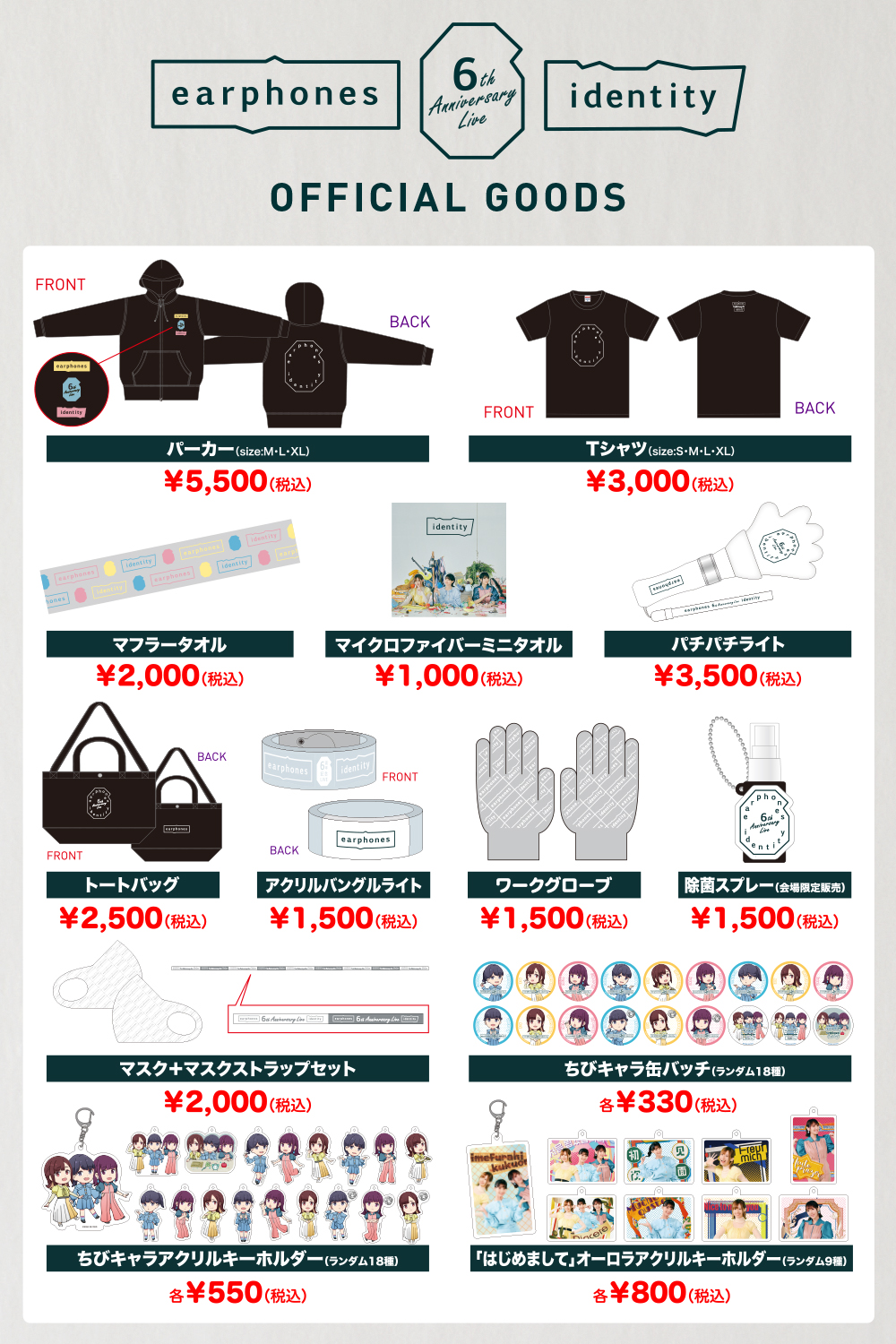 EARPHONES’ 6th Anniversary Live Event “identity” is scheduled to be held at TACHIKAWA STAGE GARDEN in Tokyo on January 30, 2022 (Sun). In addition to commonly popular goods such as hoodies and T-shirts, various other original goods from EARPHONES have been added into the lineup. The “Pachi-Pachi Light” was created under the circumstances where attendees are not able to shout out during the performance, and it can be used to make a sound to participate directly in the live event. “Work Gloves” are also being made available with the intention of reducing contact with bare hands as much as possible, and other general sanitary items such as alcohol spray and masks/mask strap sets will also be made available.