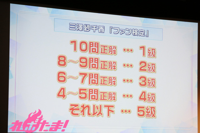 During the “Fan Test” segment, 10 questions about Misawa were prepared by Misawa in advance, and depending on the number of correct answers the fans gave, a score of 1 to 5 was given out. Such questions as “The current number of Twitter followers is greater than 173,000,” or “I was born late,” or “The service that I first charged money for was ‘Post Pet’,” and so on. The “heroes” who had come to the venue feeling prepared ended up seeming to be quite worried.