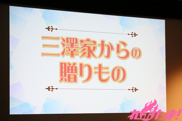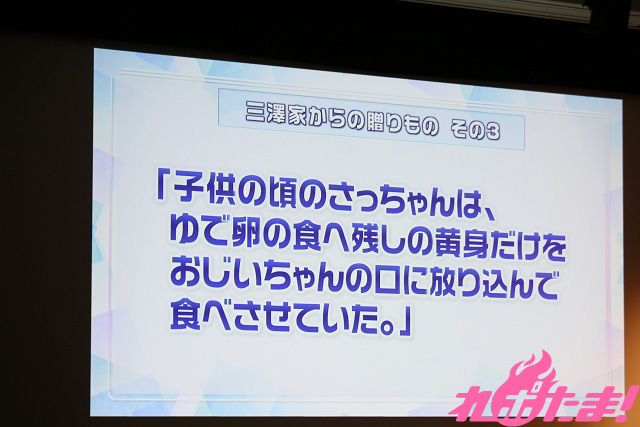 In the “Gifts from the Misawa Family” segment, “Tarekomi Info” from her father was shown to everybody. One thing revealed here was “When she was a baby, (Misawa) couldn’t sleep very well, but whenever I took her out for a drive she would fall asleep right away.” Another thing revealed was “She used to call a “glass” a “pock”.