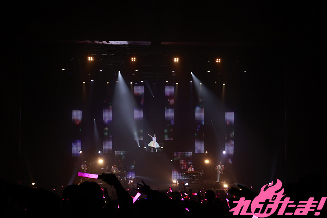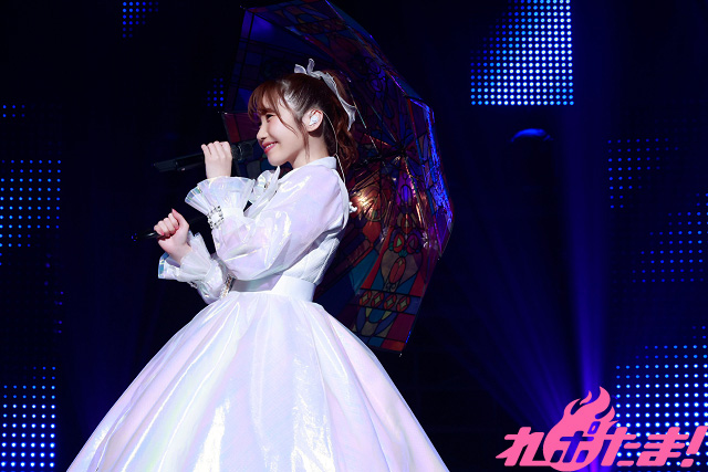 手にしたパラソルをくるくると回しながら「Sweet Rain」を歌唱すると、ここからは「虹」にちなんだ色とりどりのナンバーを披露していく。赤い光に照らされて「Ruby eclipse」、さらに「オレンジ」、投げキッスをしながら「Yellow Sweet」、そして1stシングルから「アップルミント」を歌唱。さらにピアノソロからの「Pale Blue」、紫のペンライトに照らされて「SUMILE SMILE」と続けると、ステージ後方の高台から会場全体に響き渡るような歌声で「ピンク・マゼンダ」を歌い上げた。「Merry Go」を歌う前には「みんな、好きな色(のペンライト)を振ってね!」と叫び、自らもペンライトを手に熱唱した。