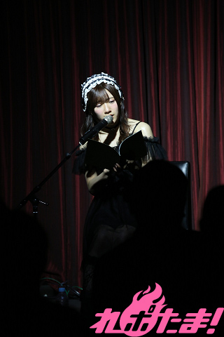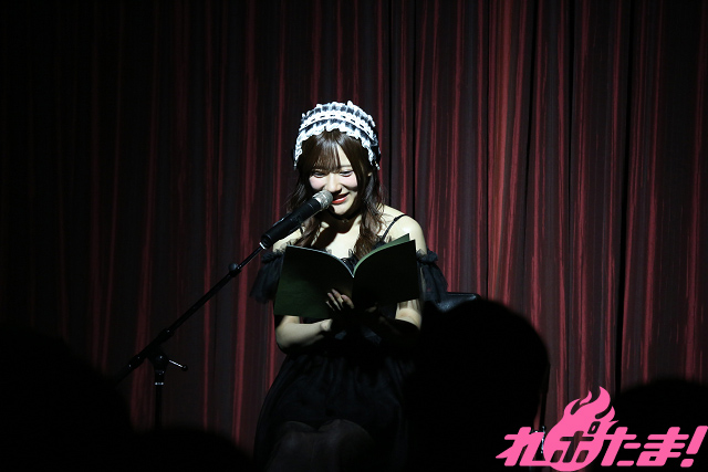 お次は「昼の部を観に来ていた実妹が寝落ちしてしまった」という朗読コーナー。夜の部では新美南吉の名作童話『手袋を買いに』を披露。母さん狐と子狐の声を見事に演じ分け、オーディエンスを作品の世界に誘っていた。