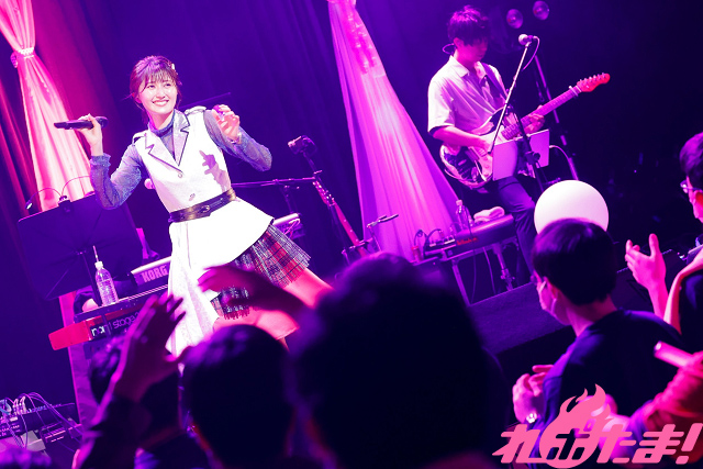 続いてのブロックではバンドメンバーが満を持して登場。「今日は」をアコースティックアレンジで披露すると、軽快なリズムに乗せて「happy weekend」を歌い上げた。さらに「On My Way」の曲間では、「念願だった」というバンドメンバーの紹介で盛り上がった。人見知りの駒形さんは「ライブ直前のゲネプロで、ようやくみんなと一緒に食事ができました!」と裏話を語り、メンバーを笑わせていた。