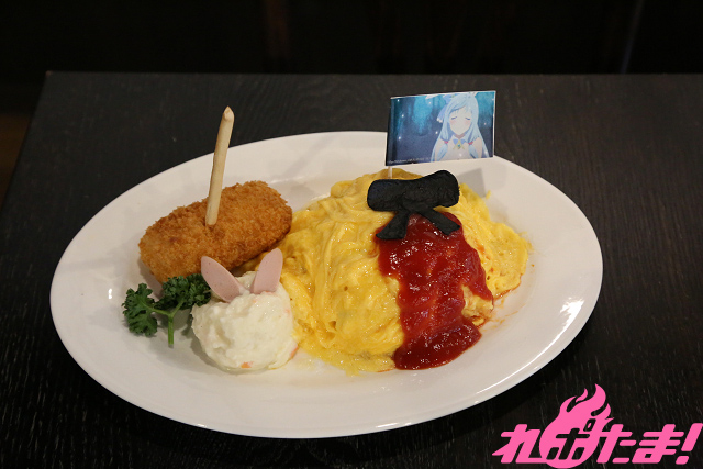 ユエをイメージしたオムライスには黒いリボン(トルティーヤ)と血のようなトマトソースを添え、シアをイメージしたポテトサラダにはうさ耳を。カニクリームコロッケでできたドリュッケンを添えて。オムライスだけでは物足りないアナタに!