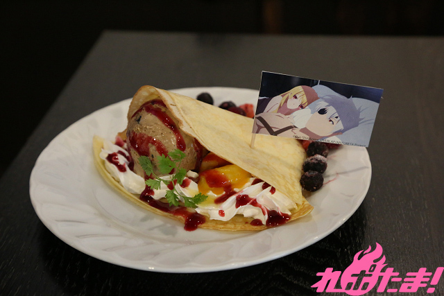 白いホイップの上に、ハジメをイメージしたエスプレッソクッキーアイスと、ユエをイメージしたバナナとマンゴーソースをかけ、布団のようなクレープで包んだ一品。クッキーのサクサク感とバナナの甘みもたっぷり楽しめる!